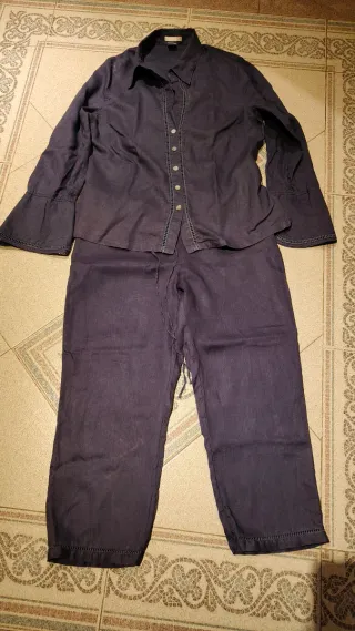 Conjunto de dos piezas de lino en color gris humo - Camisa de manga larga con botones. - Pantalón con cordón en la cintura.. Mangas, bajos, cintura rematadas como en una vainica doble
