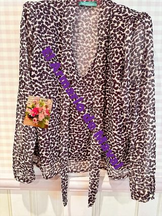 Camisa con estampado de leopardo y detalle de lazo. - Diseño con cuello halter. - Mangas largas. - Tejido ligero. Es muy bonita, es en color morado estampado con lazo e hilo plateado tiene 52 cm de sisas