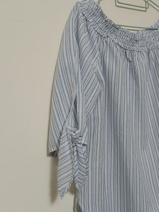 Camisa con diseño de rayas y fruncido en los hombros. Medidas: hombro 40cm., pecho 55cm., largo 54cm. - Estilo hombros descubiertos. - Mangas con lazada. - Tejido ligero.