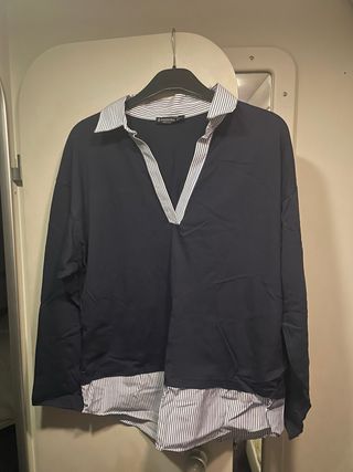 Camisa de manga larga con cuello de camisa a rayas. Talla xs grande - Diseño de dos piezas. - Cuello de camisa a rayas blancas y azules. - Cuerpo de camisa azul marino