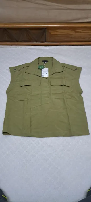 Camisa sin mangas con un diseño moderno y práctico. - Cuello camisero. - Dos bolsillos delanteros con solapa. - Detalle de hombreras con botón. - Corte recto.