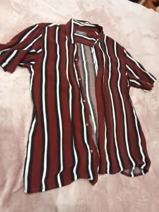 Camisa de manga corta con un diseño de rayas verticales. - Patrón de rayas en rojo, negro y blanco. - Cuello camisero. - Cierre de botones. -NO HAGO ENVÍOS-