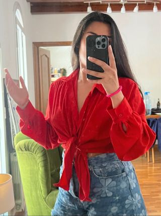 Camisa roja plisada con lazada