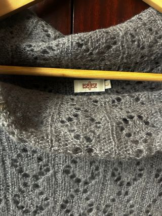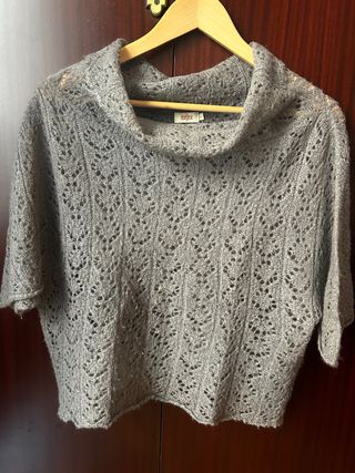 Jersey de punto fino con cuello alto y manga corta. - Diseño calado con motivos geométricos. - Tejido suave y ligero. - Corte cropped. Para ir encima de camisas o camisetas. En muy buen estado. 39% acrílico. 30% nylon. 28% mohair. 3% lana.