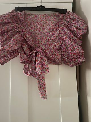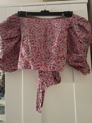 Conjunto formado por una camisa de mangas cortas con estampado de flores junto a un pantalón de pierna ancho. La camisa llega por la cintura. Talla L camisa, Talla M, pantalón. Con etiqueta, sin usar. Cualquier duda pregunten sin problema.