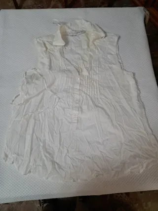 Camisa blanca de estilo premamá, ideal para comodidad durante el embarazo. Presenta un diseño con cuello camisero y botones frontales. - Diseño sin mangas. - Detalle de plisados en la parte delantera. - Tejido ligero y vaporoso.