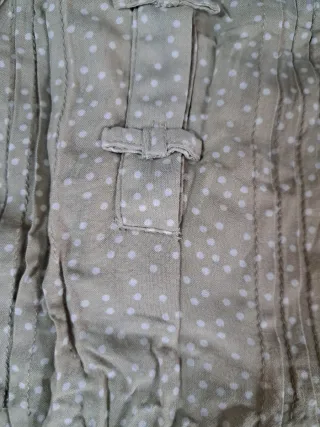 Camiseta de gasa sin mangas T-XL. El fondo de la camisa es color beige con lunares negros. Cuello y sisa con ribete negro. Lacito en la espalda del mismo tejido que la camisa. Medidas al final de las fotos