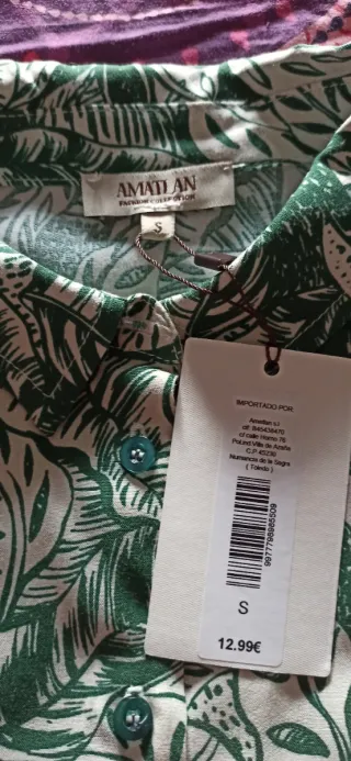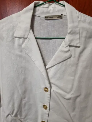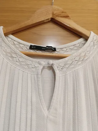 Preciosa camisa sin mangas con un diseño texturizado. - Cuello camisero. - Cierre de botones en la parte delantera. - Bajo con vuelo -. Color blanco roto _ Tiene dos manchas en ambas axilas ( prácticamente no se notan) - Envío rápido
