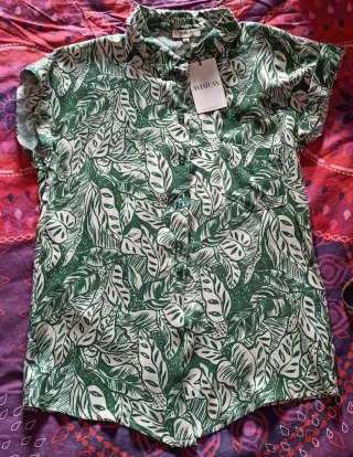 Clásica camisa Uniqlo de manga corta y cuello abierto. Nueva, sin uso, en excelente estado. Talla M de mujer. Color verde oliva. Viscosa 47% Lino 35% Algodón 18% - Tejido ligero. - Fácil planchado. - Diseño versátil para llevar abrochada o como sobrecamisa de verano.