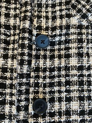 Sobrecamisa de cuadros en blanco y negro de Stradivarius. Tiene botones rígidos negros, dos bolsillos grandes visibles y dos bolsillos ocultos. Es de una tela que abriga, puños en las mangas y no se ha usado nunca.