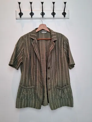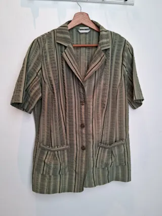 Chaqueta tipo camisa de mangas cortas con un diseño texturizado a rayas. - Cierre de botones. - Dos bolsillos delanteros. - Cuello solapa.