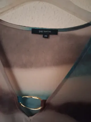 Camisa de manga larga con un diseño de rayas abstractas en tonos azules y marrones. Presenta un escote en pico con un bonito detalle en dorado. - Diseño de rayas abstractas. - Escote en pico con detalle metálico.