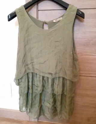 Camiseta sin mangas con un diseño fresco y ligero, ideal para días cálidos. Su tejido tiene una textura arrugada que le da un toque único. - Diseño de tirantes. - Capas superpuestas con volantes en la parte inferior. - Abertura en la espalda con cierre de botón.
