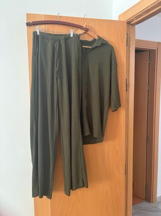 Conjunto de dos piezas formado por pantalón y camisa. - Pantalón largo con cintura elástica y cordón. - Camisa de manga larga con cuello y botones.