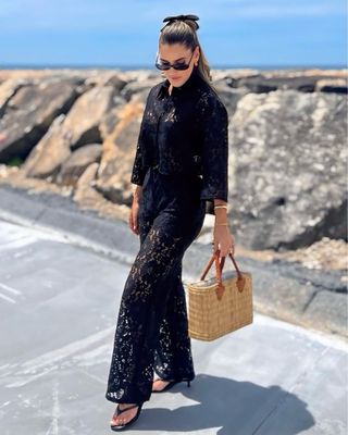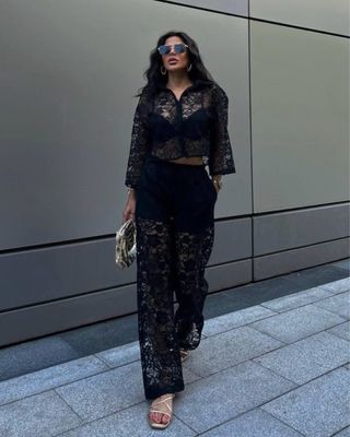 Elegante conjunto de dos piezas de encaje. - Camisa con cuello y manga larga. - Pantalón de pierna ancha. - Diseño transparente.