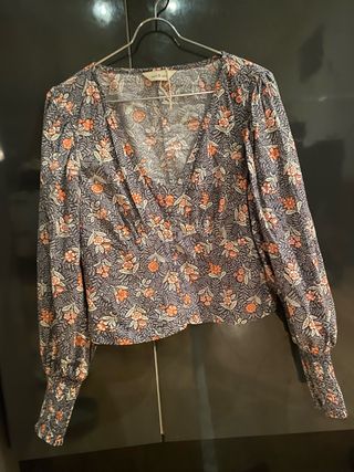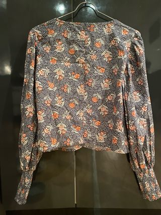 Camisa de manga larga con un diseño moderno. Talla S. 5 euros. Entrega en Oviedo y pago en efectivo. - Tejido principal texturizado en gris claro. - Mangas y parte inferior con estampado floral en azul y beige. - Volante en el bajo para un toque femenino. - Puños con detalle de volantes.