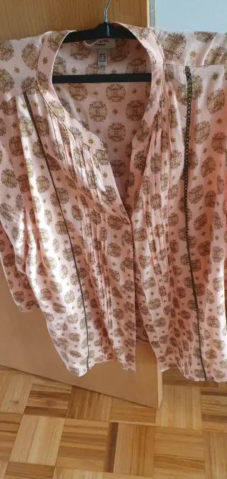 Conjunto de pantalon talla S y camisa talla S (amplia). Puesto una vez. - Mangas largas con lazadas en los puños. - Corte recto y favorecedor. - Tejido con un acabado satinado.