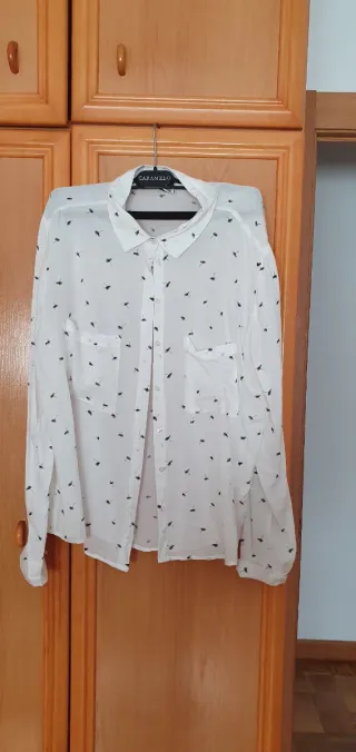No se ha llegado a estrenar. Es una preciosidad de camisa holgada que podría equivaler a una talla única. La manga es francesa y abullonada. Ideal para llevar suelta, encima de un pantalón ajustado o debajo de un peto o pichi holgado. En venta por un precio muy inferior al que me costó. La vendo porque aunque me encanta no la termino de estrenar y es una pena tenerla guardada.
