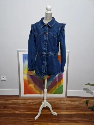 Camisa vaquera de mujer con un diseño moderno y cómodo. Medidas: Ancho 65 cm. Largo 60 cm. - Manga corta con volantes. - Cierre de botones. - Cuello camisero.