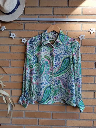 Camisa de manga larga con un estampado original y llamativo. - Diseño con motivos de naturaleza y elementos asiáticos. - Cuello camisero. - Cierre de botones. - Talla M-L amplia (da para una talla 42 amplia)