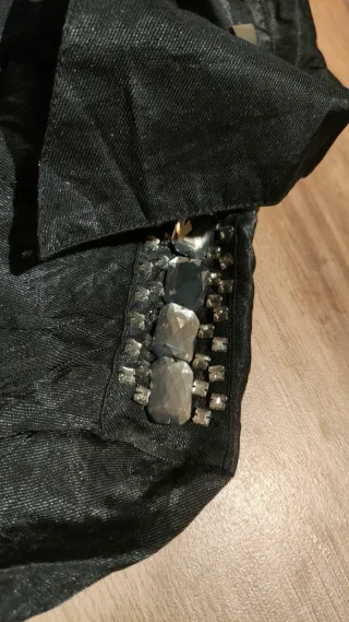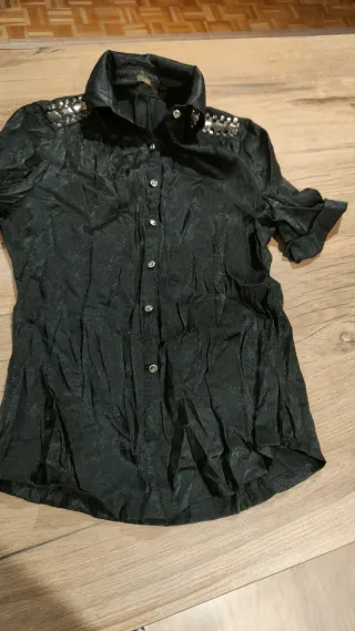 Elegante camisa negra para mujer con acabado tipo satén y detalles de pedrería en los hombros. - Diseño con cuello - Cierre de botones - Mangas cortas - Adornos plateados en los hombros