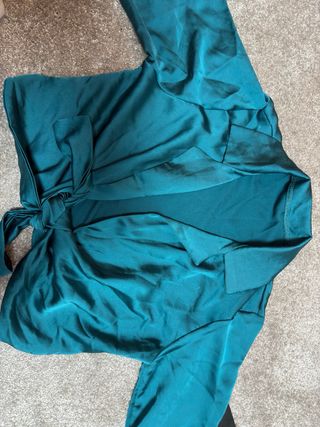 Elegante camisa satinada con un diseño cruzado y atado. - Tejido satinado brillante. - Cuello camisero. - Mangas largas con puños. - Detalle de nudo frontal.