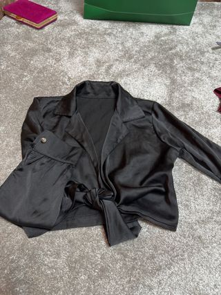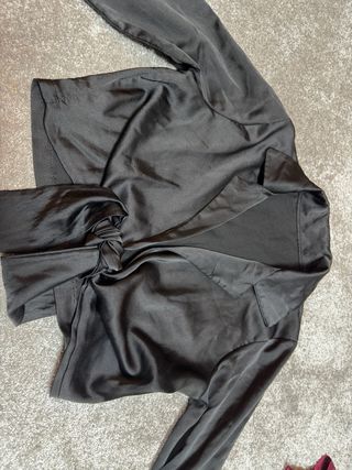 Elegante camisa de satén con un diseño moderno. - Tejido de satén brillante. - Cierre frontal anudado. - Mangas largas con detalle en puño.