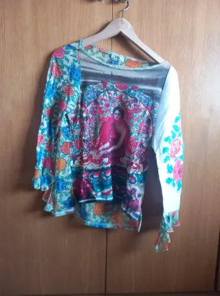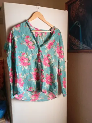 Bonita blusa con estampado floral. - Diseño con escote Bardot. - Cintura elástica fruncida. - Mangas largas con volantes en los puños. Es muy favorecedora, la vendo porque ahora mismo me queda pequeña pero está puesto en 2 ocasiones.