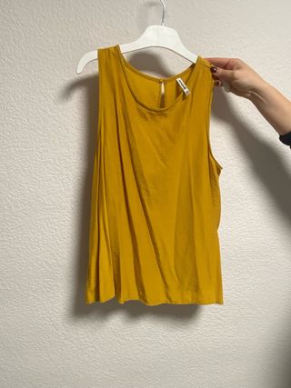 Camisa sin mangas en un vibrante color mostaza. Su diseño versátil la hace perfecta para cualquier ocasión. - Corte holgado. - Detalle de botón en la espalda. - Tejido ligero y fluido.