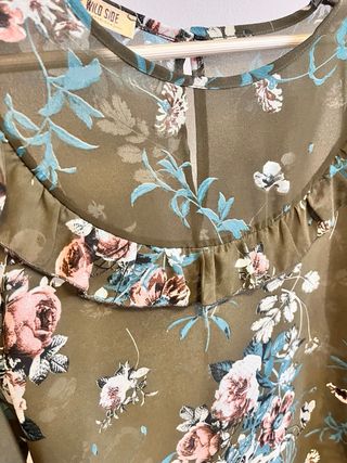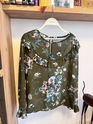 Bonita camisa semitransparente con estampado floral. - Diseño con volantes en el escote. - Mangas largas con detalle en los puños. - Tejido ligero y vaporoso. Medidas 40 cm Largo 60 cm #camisa #camisamujer