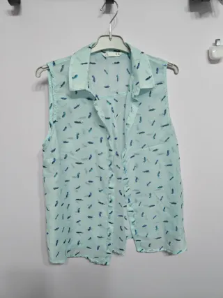 Camisa sin mangas con un estampado de plumas en tonos azules y turquesa. Es una prenda ligera y fresca, ideal para combinar. - Diseño sin mangas. - Estampado de plumas. - Tejido ligero y un poco transparente.