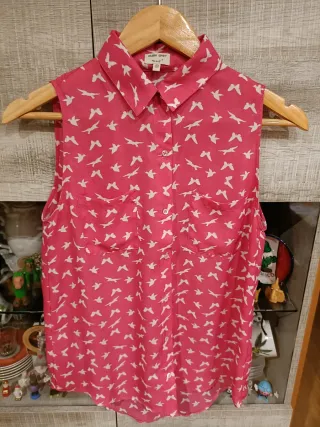 Camisa sin mangas con un divertido estampado de pájaros. Diseño sin mangas. Cuello camisero. Bolsillos en el pecho. Cierre de botones.