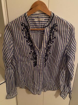 Camisa de Sfera con un diseño de rayas verticales en azul y blanco. Presenta un detalle bordado en la parte delantera. - Cuello mao. - Manga larga. - Bordado floral en contraste.