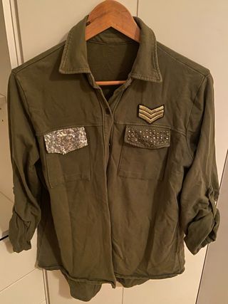 Camisa o chaqueta de color verde con detalles llamativos. - Parche de lentejuelas plateadas en el bolsillo izquierdo. - Adorno de galón dorado y tachuelas en el bolsillo derecho. - Mangas enrolladas con trabilla.