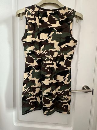 Camiseta sin mangas con estampado de camuflaje y detalles metálicos. - Diseño con tachuelas plateadas. - Pequeñas calaveras decorativas integradas. - Cuello redondo.