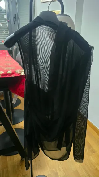 Elegante camisa de malla transparente para mujer. Su diseño moderno y sofisticado la hace ideal para diversas ocasiones. - Manga larga. - Cuello alto. - Tejido ligero y vaporoso.