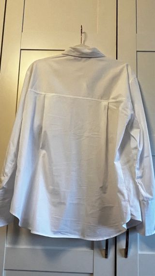 Un básico que no puede faltar. Camisa de Zara en color azul celeste/claro. •Detalles: Corte recto con cuello clásico y cierre de botones. Tiene un detalle de tabla en la espalda que le da una caída muy bonita. • Talla: S (talla amplia, perfecta para llevar estilo oversize). • Estado: En muy buenas condiciones, poco uso. • Tejido: Algodón ligero, muy agradable al tacto.