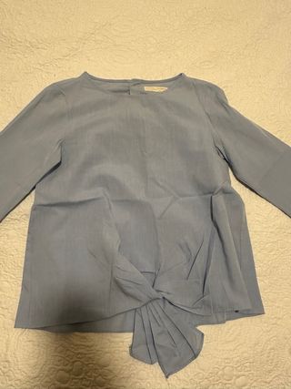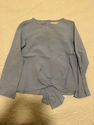 Camisa, blusa celeste, manga larga con lazada decorativa, de Zara, talla 13/14 equivale a una XS mujer