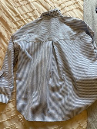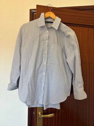 Camisa de Zara con un diseño de rayas verticales en azul y blanco. La prenda tiene un corte holgado y es ideal para un look casual. - Diseño de rayas azules y blancas. - Cuello camisero. - Cierre de botones. - Mangas amplias.