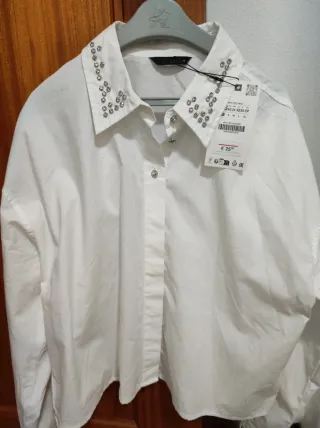 Preciosa camisa blanca de Zara, con un diseño elegante y detalles de pedrería. - Cuello con adornos de pedrería. - Botones frontales con pedrería. - Manga larga.