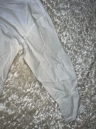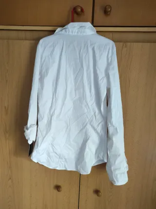 Camisa blanca de Zara, talla L. Prenda seminueva con un diseño elegante. La tapeta va ribeteada con perlitas y un hilo/tira con brillo, tipo joya, que eleva muchísimo la camisa. Además, el primer botón del cuello y los de los puños son botones joya.