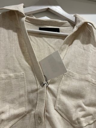 Camisa de lino en color beige. - Cuello camisero. - Bolsillos en la parte delantera. - Mangas enrollables.