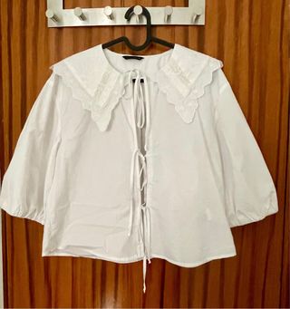 Camisa crop de Zara con un diseño moderno y fresco. - Cuello Peter Pan con bordados. - Cierre frontal con cordones. - Mangas abullonadas hasta el codo. - Puesta una sola vez.