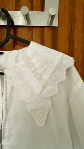 Camisa blanca de Zara con un bonito cuello bobo. - Cuello con volantes y encaje. - Bordados florales discretos en el cuello. - Cierre de botones en la parte delantera ocultos por solapa. - Manga larga acabada en puño. Color blanco roto. 0881/122/251 Nueva. A estrenar. Agotado en tienda.