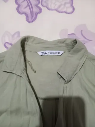 Camisa de Zara Woman Studio en color verde oliva. Presenta un diseño elegante y moderno. - Cierre de botón. - Dos bolsillos en la parte delantera. - Puños con botón.
