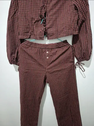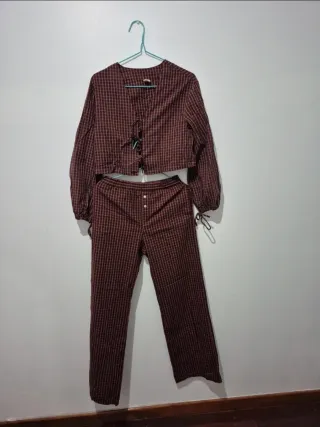Conjunto de dos piezas de Zara con estampado de cuadros. - Camisa corta con lazada. - Pantalón largo. - Mangas largas abullonadas. - talla S-M