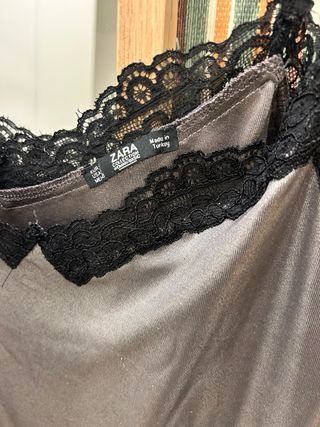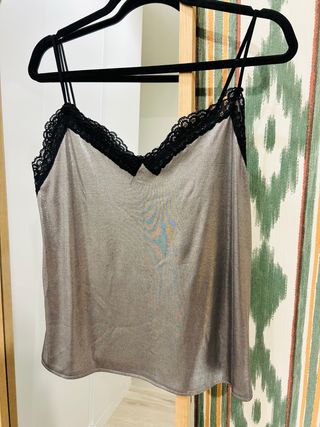 Este top lencero de Zara es una prenda elegante y versátil. - Color plateado brillante. - Detalle de encaje negro en el escote. - Tirantes finos ajustables.