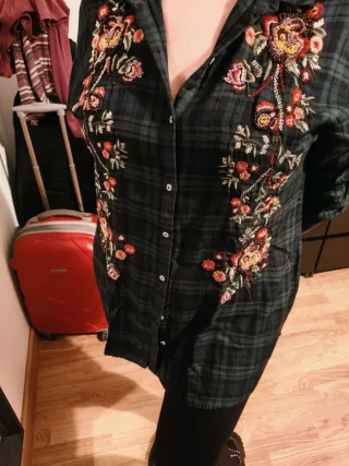 Camisa de cuadros con un bonito bordado de flores en la parte delantera. - Diseño de cuadros blanco y negro. - Bordado floral multicolor. - Cuello camisero. - Cierre de botones. - Aunque es XS da muchísima talla. Yo tengo la S y queda overaize.