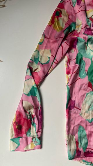 Elegante blusa de Zara con un estampado floral vibrante y un detalle de lazada en el cuello. - Diseño con cuello de pico y lazada. - Mangas largas abullonadas. - Estampado de flores rosas y amarillas sobre fondo claro.