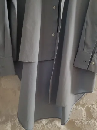 Camisa estilo masculina de popelín con un diseño asimétrico y oversize. - Corte moderno y favorecedor. - Detalle de botones. - Mangas largas con puños. - Diseño asimétrico. Tiene dos desperfectos: una mancha como de oxido en la manga izquierda, y una manchita negra en la espalda. Se aprecian en las fotos.